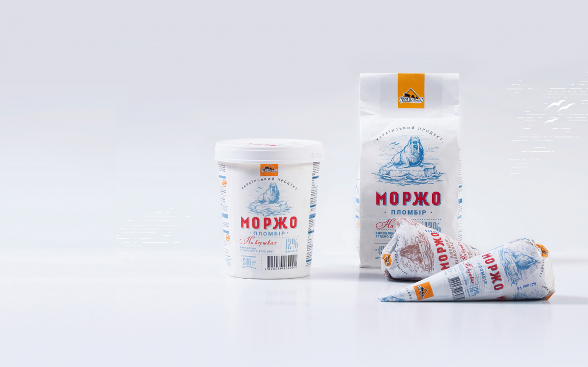 Sometimes you want to sit on a sofa, close your eyes, and remember the happy moments of your childhood. Remembering their carefree childhood, everyone came up with the name and label design for the ice cream from TM “Try Vedmedi”. Here, take Morzho, friends. Let’s remember the past. It was good, and tomorrow will be even better! Friendly walrus sitting on an ice floe, winks and invites us to eat tasty and refreshing ice cream. Morzho. The design you want to hug.